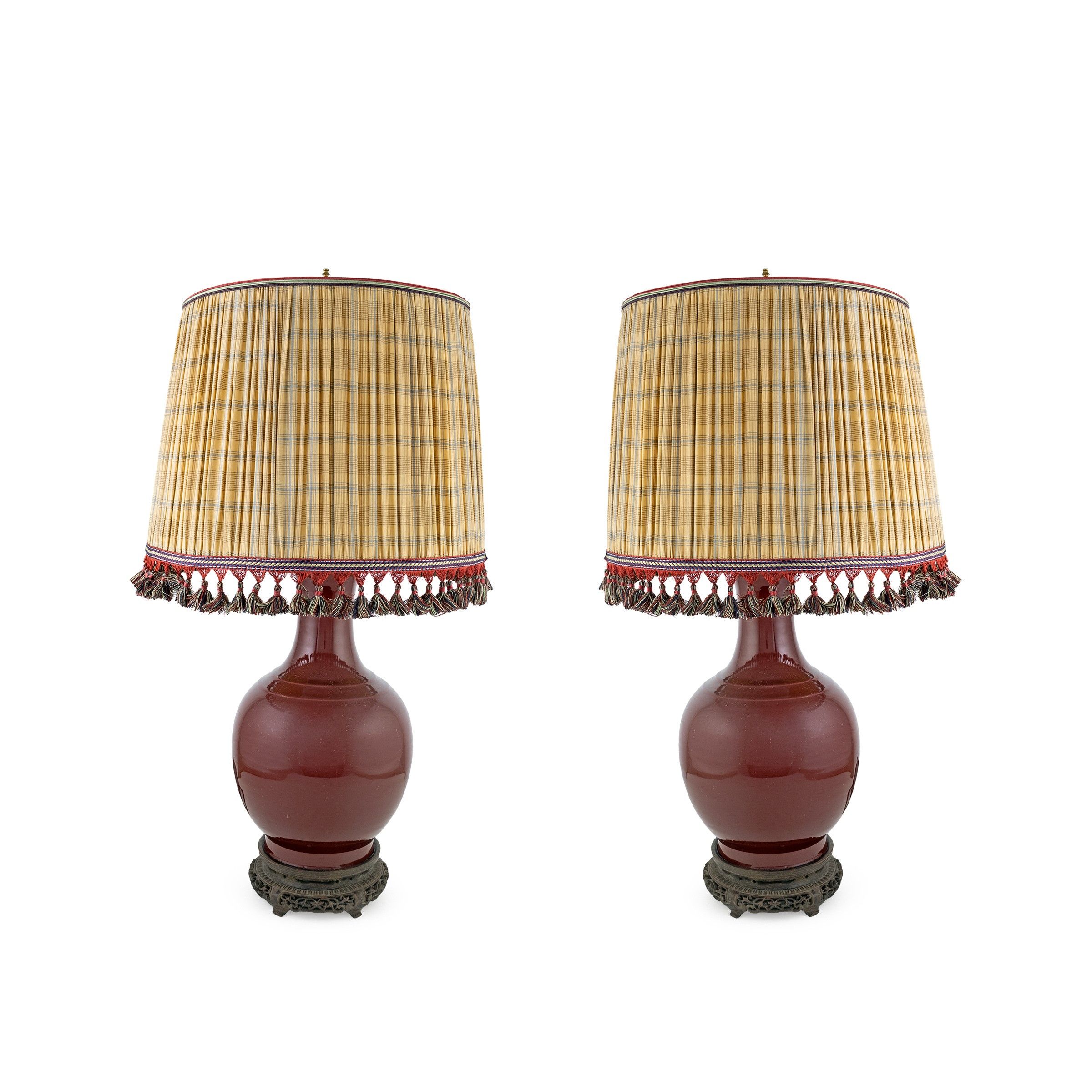 Coppia di vasi elettrificati in ceramica smaltata sangue di bue