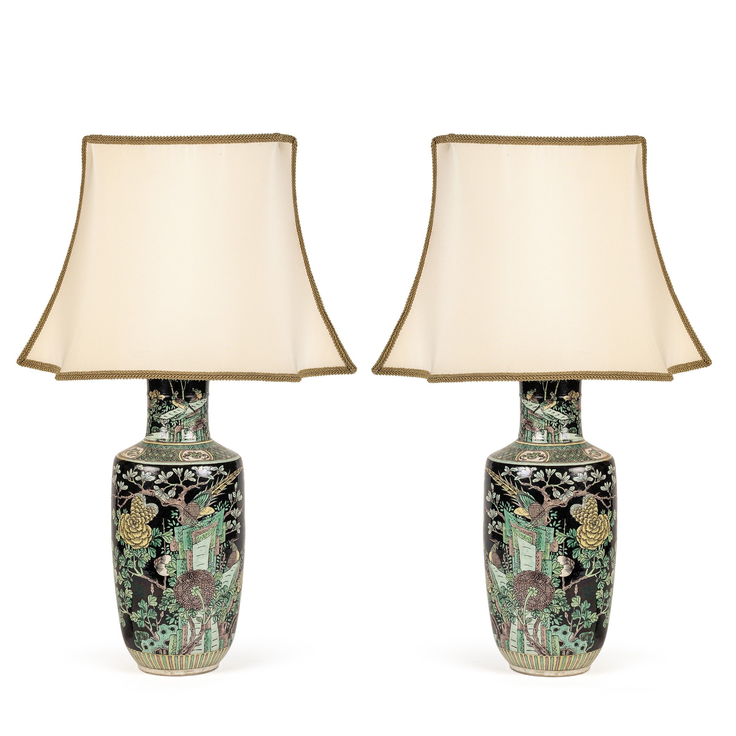 Cina, XX Sec. decorato con motivi floreali su fondo nero, restauri, completi di paralumi