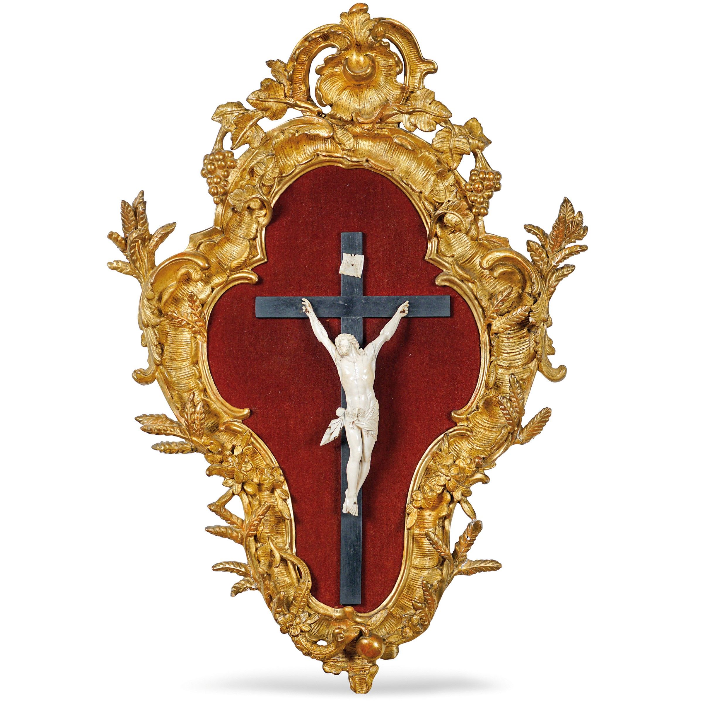 cornice 103x104 cm. - scultura 27,5x34 cm. Francia, inizio del XIX Sec. scolpito a motivi vegetali e roccailles con conchiglia superiore, all'interno scultura in avorio a tutto tondo raffigurante Cristo su croce in legno ebanizzato, nella parte superiore un cartiglio con le iscrizioni, cornice con usure e restauri Il lotto è completo di attestato di libera circolazione e certificato Cites