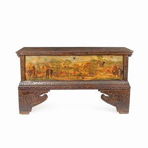 89x159x56 cm. Nord Europa, XIX-XX Sec. fronte decorato in policromia con scene di villaggio e fianchi decorati [..]