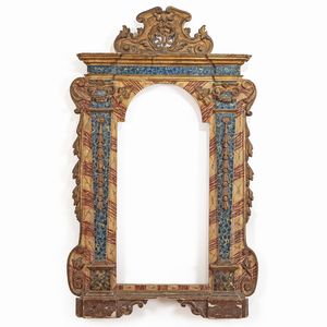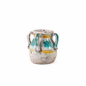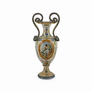 h. 58 cm. Italia meridionale, XX Sec. decorato in policromia con motivi di grottesche, manici a foggia di serpenti, [..]
