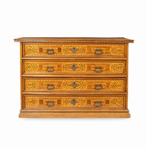 105x158x54 cm. Emilia, XVIII Sec. fronte a quattro cassetti, decoro ad intarsio con riserve mistilinee in legno [..]