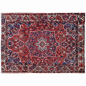 380x330 cm. XX Sec. disegno floreale e geometrico su fondo rosso e blu, lievi difetti