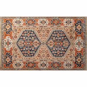 243x155 cm. XX Sec. decoro floreale e geometrico su fondo beige e arancio