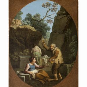 40x31 cm. Roma XVIII Sec. Contadini presso una fontana, olio su tela, entro cornice
