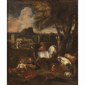 58x49 cm. tardo XVII Sec. Paesaggio con figure ed armenti, olio su tela, entro cornice