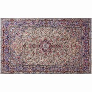 280x175 cm. Persia, XX Sec. disegno floreale policromo su fondo blu e azzurro, difetti