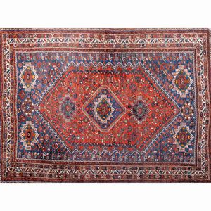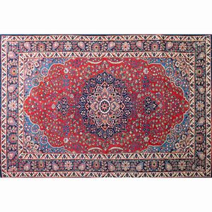 380x330 cm. XX Sec. disegno floreale e geometrico su fondo rosso e blu, lievi difetti