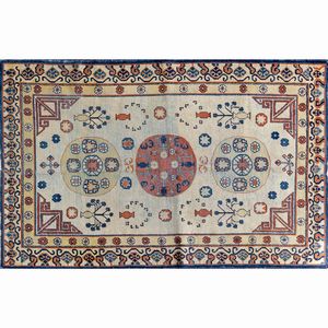 120x190 cm. XX Sec. disegno floreale e geometrico su fondo beige, usure