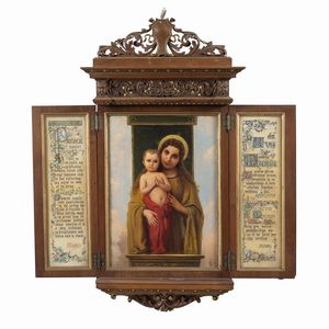 88x77x10 cm. XIX-XX Sec. Madonna con Bambino, trittico olio su tavola, siglato FV in basso a destra, ai lati [..]