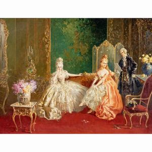 65x83 cm. Italia XIX - XX Sec. Scena d'interno con figure, olio su tela, firmato in basso a sinistra, entro c [..]