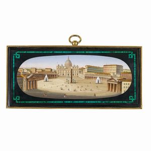 38x18x2,5 cm. Roma, XIX Sec. raffigurante Piazza San Pietro, entro riserva rettangolare in malachite su nero [..]