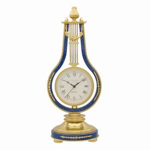 h.26,5 cm. Svizzera, Anni 90 modello Le Locle, struttura a lira in bronzo dorato e laccato a simulare il lapislazzulo, [..]