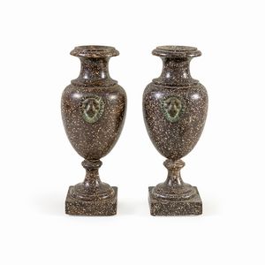 h. 32 cm. Roma, XIX Sec. decorati a simulare il porfido, ai lati fregi in bronzo cesellato con teste leonine