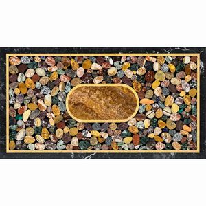 3x108x59 cm. XX Sec. centrato da una riserva ovale in alabastro circondato da ciottoli in marmi vari, bordo filettato [..]