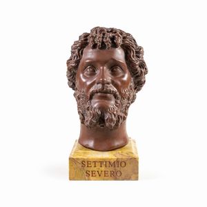 h. 26 cm. XIX-XX Sec. raffigurante l'imperatore romano Settimio Severo, poggiante su base squadrata in marmo [..]