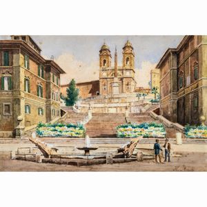 26x39,5 cm. XIX - XX Sec. Scalinata di Trinità dei Monti - Roma, acquerello su carta, entro cornice