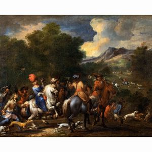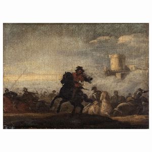 37x30 cm. Anversa 1610 - Bruxelles 1690 Due contadini e un cacciatore davanti il fuoco, olio su tela, entro c [..]