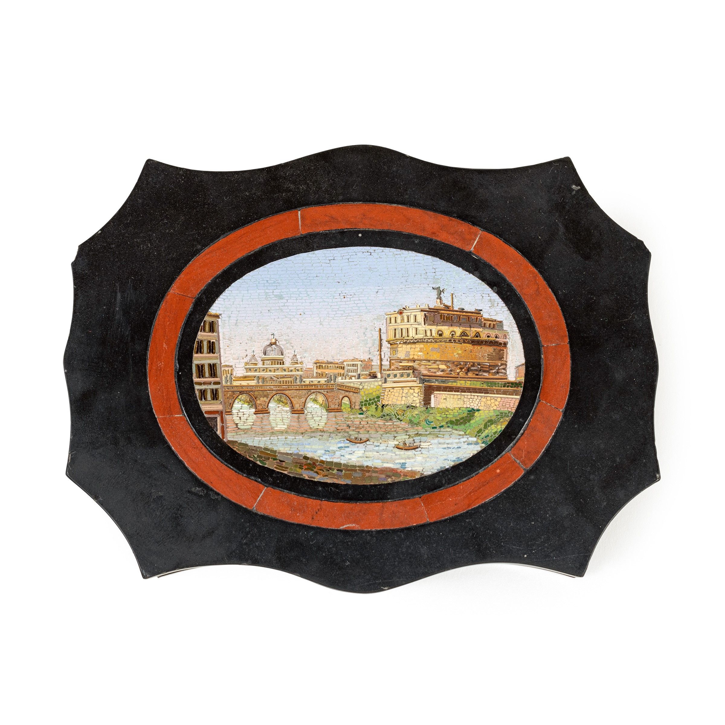 Roma, XIX Sec. corpo sagomato centrato da una veduta di Castel Sant'Angelo in micromosaico entro riserva in marmo rosso antico, lievi difetti