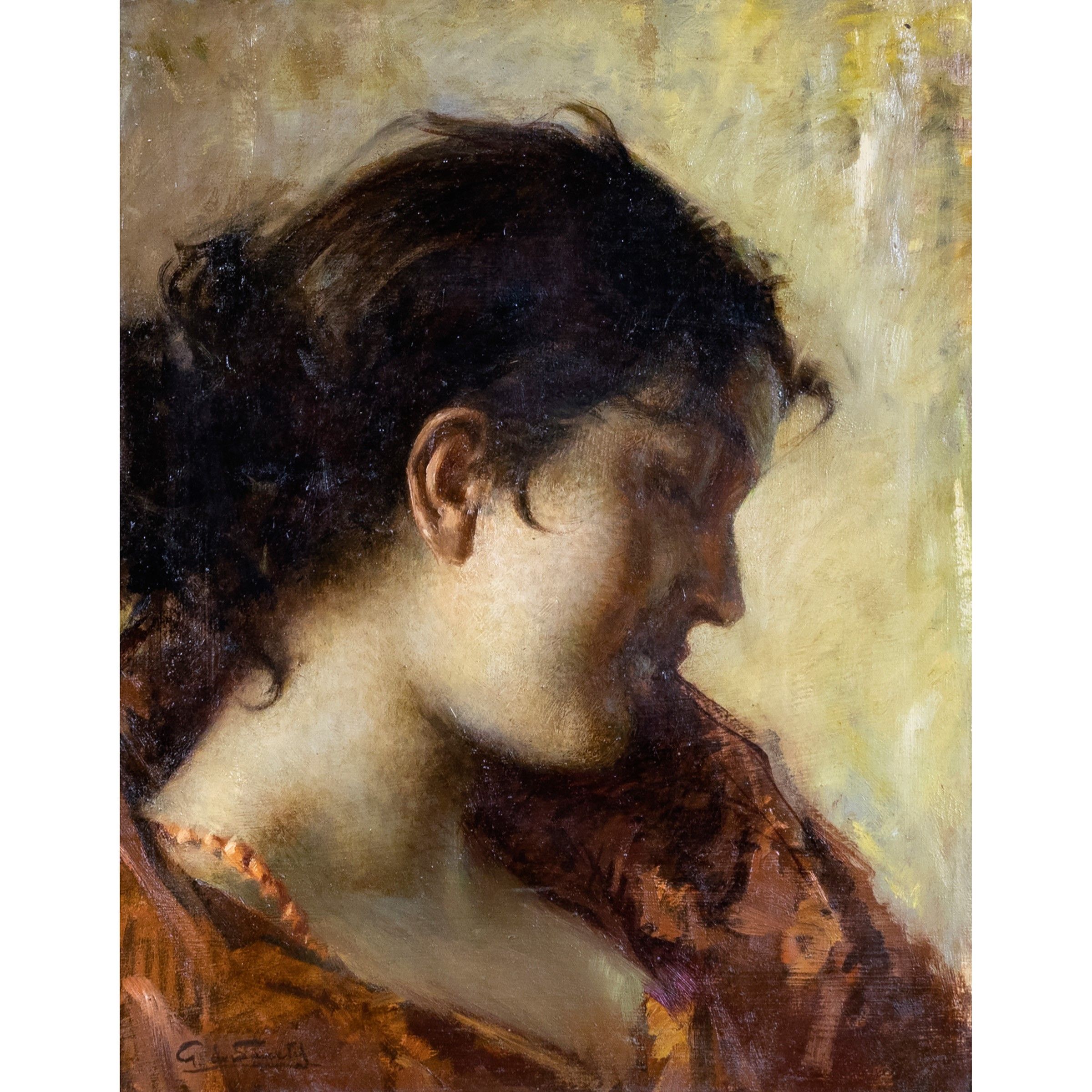 Napoli 1858 - 1924 Profilo femminile, olio su tela applicata su cartone, firmato in basso a sinistra, entro cornice