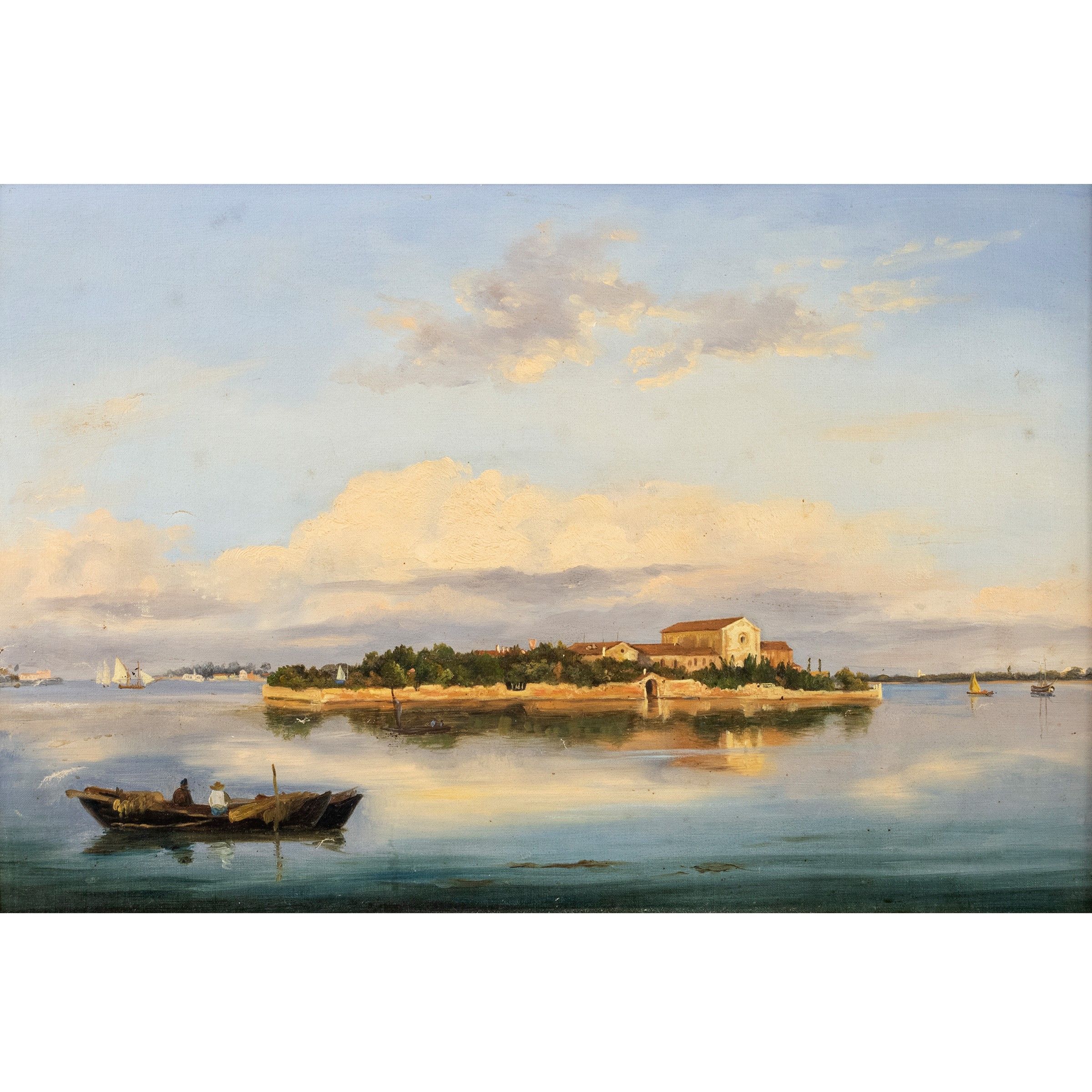 Milano 1828 - Alessandria 1883 Isolotto nella laguna, olio su tela applicata su tavola, entro cornice