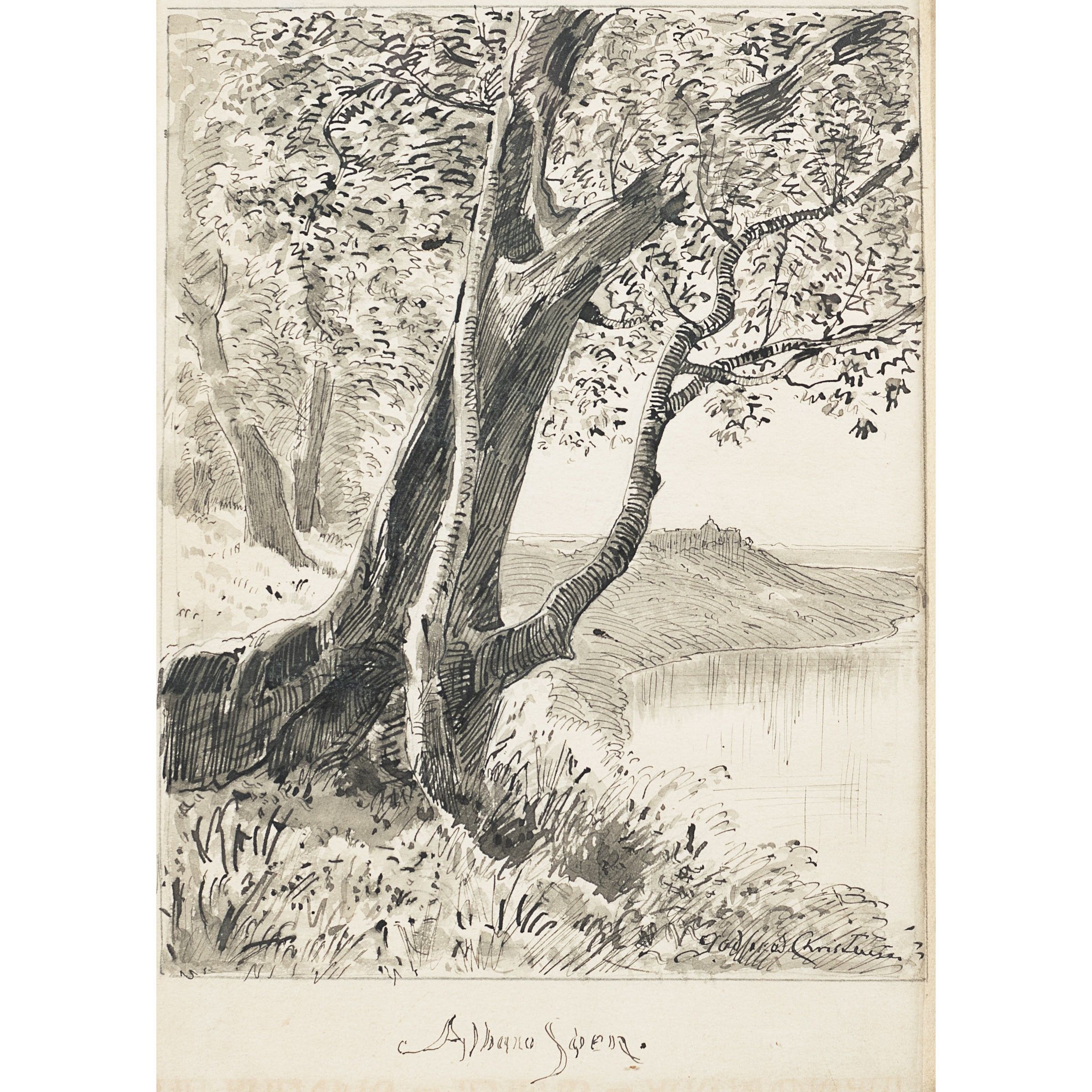 Copenaghen 1845 - 1928 Lago di Albano, china e acquerello su carta, firmato in basso a destra, entro cornice in legno dorato