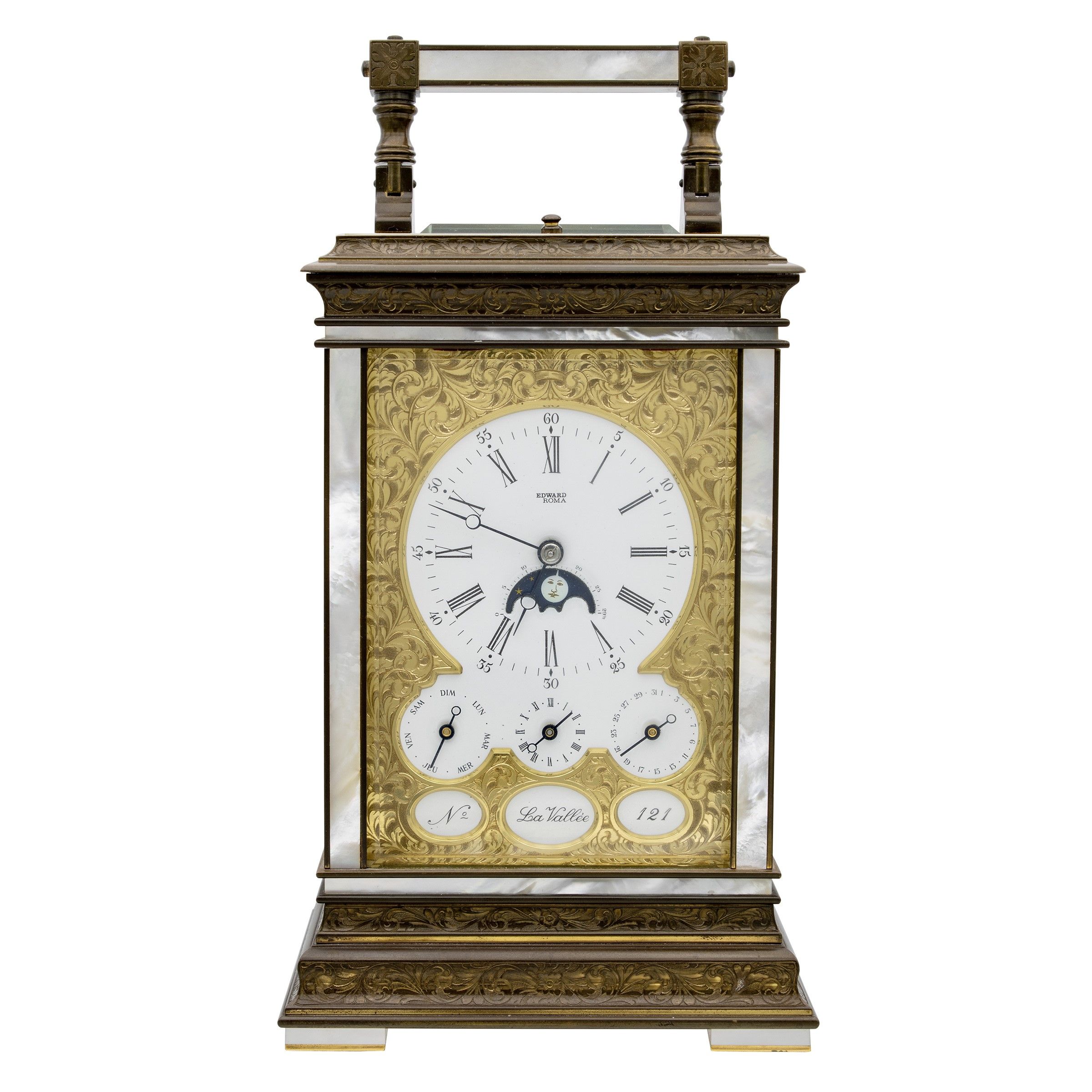24x12,5x10,5 cm. Italia, anni 80 serie limitata n.121, cassa in ottone dorato interamente cesellata con ricchi motivi vegetali e profili in madreperla, quadrante in porcellana con calendario completo e fasi lunari, movimento a carica manuale con suoneria ore e mezze ore, chiave di carica mancante