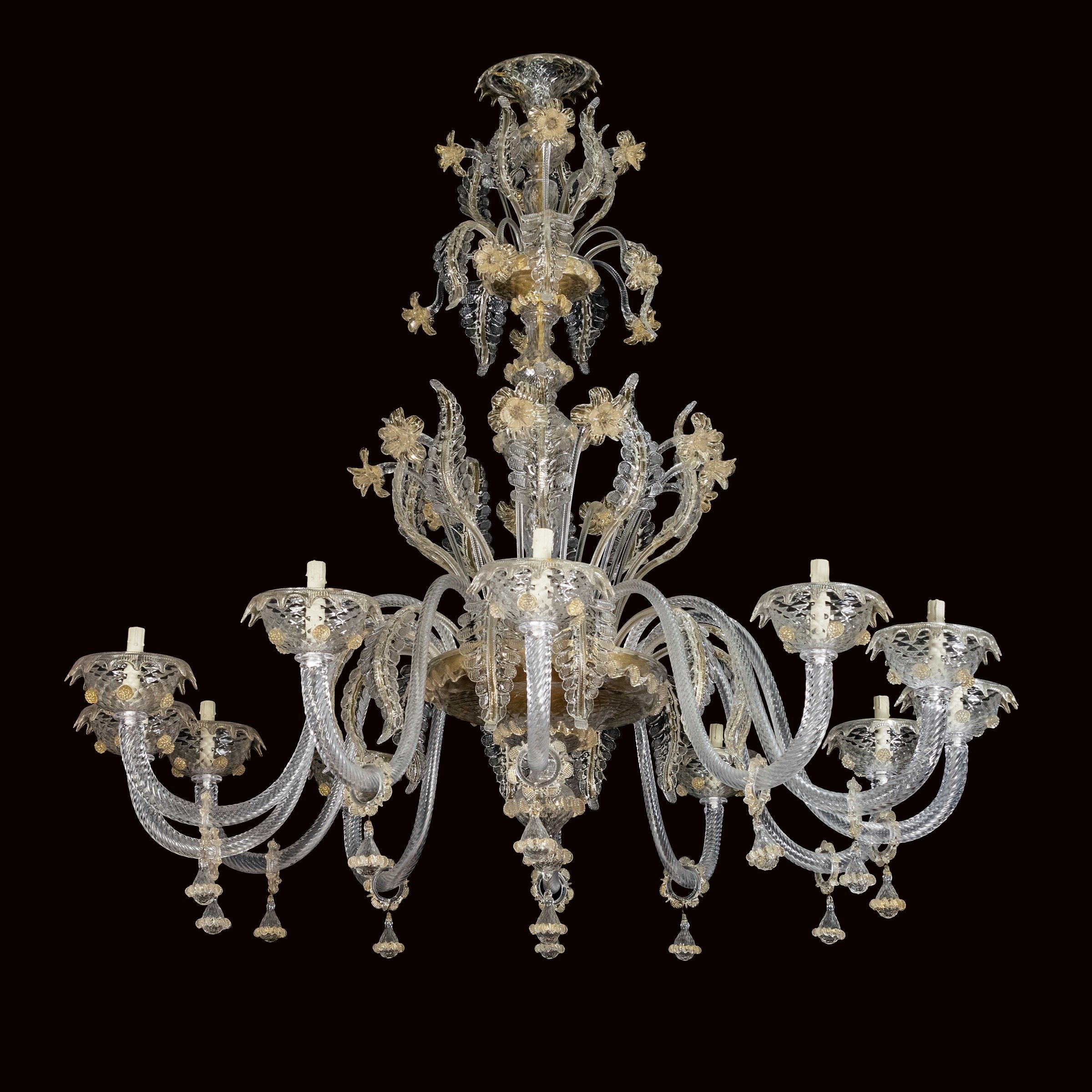 Lampadario a dodici luci in vetro trasparente e oro