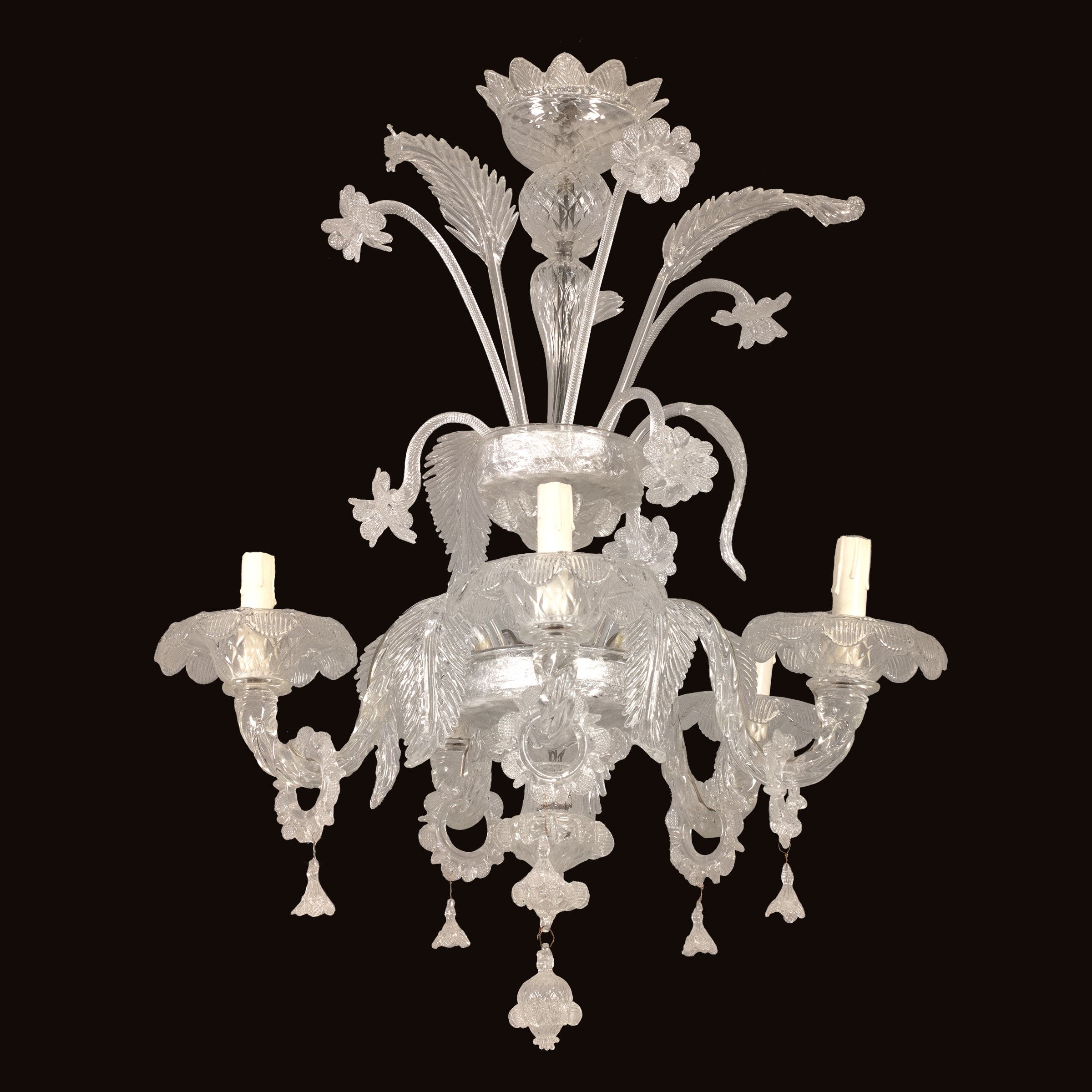 XX Sec. in vetro trasparente con inclusioni in oro, bracci mossi, fusto tornito con decorazioni floreali e vegetali, mancanze