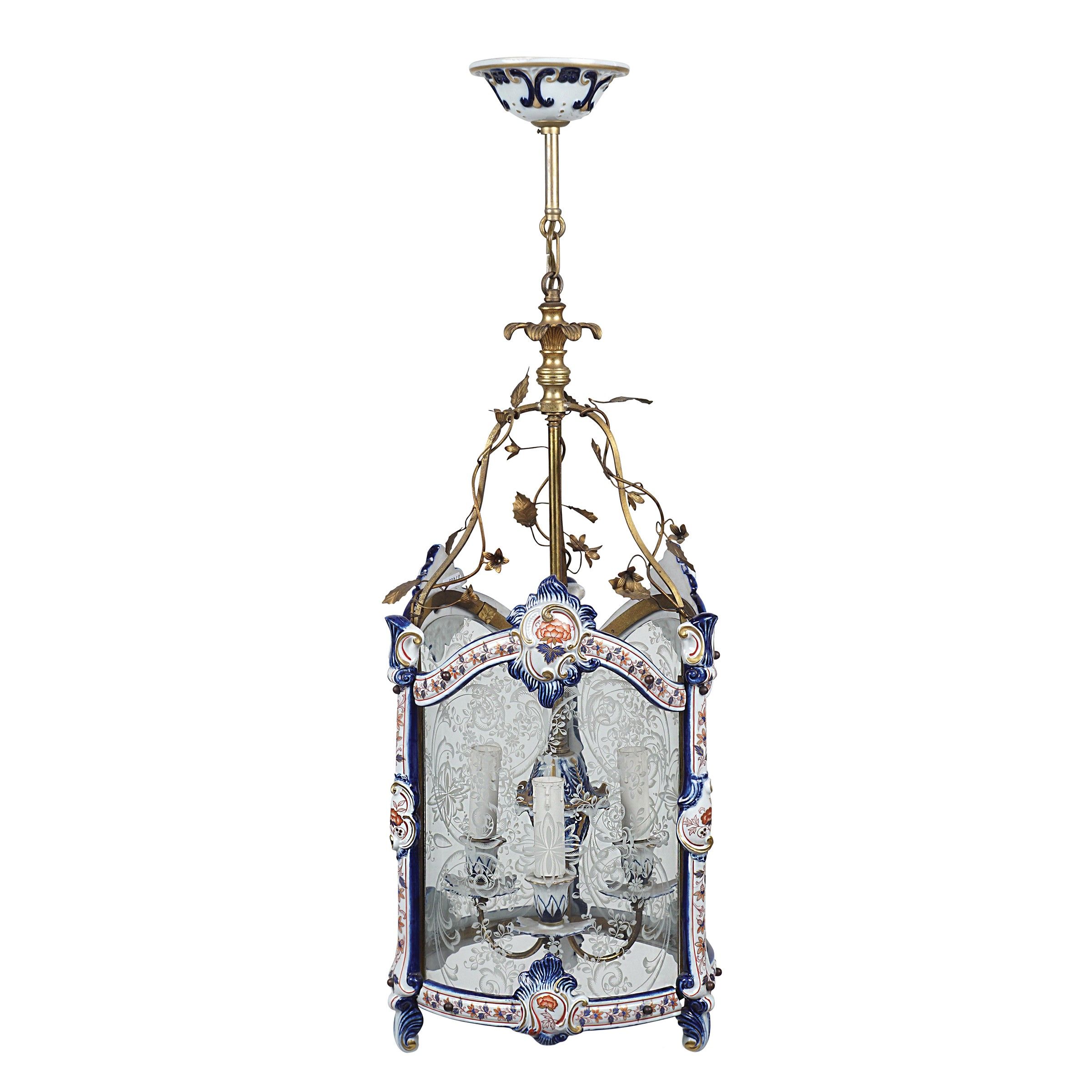 Lanterna a tre luci in metallo dorato e porcellana