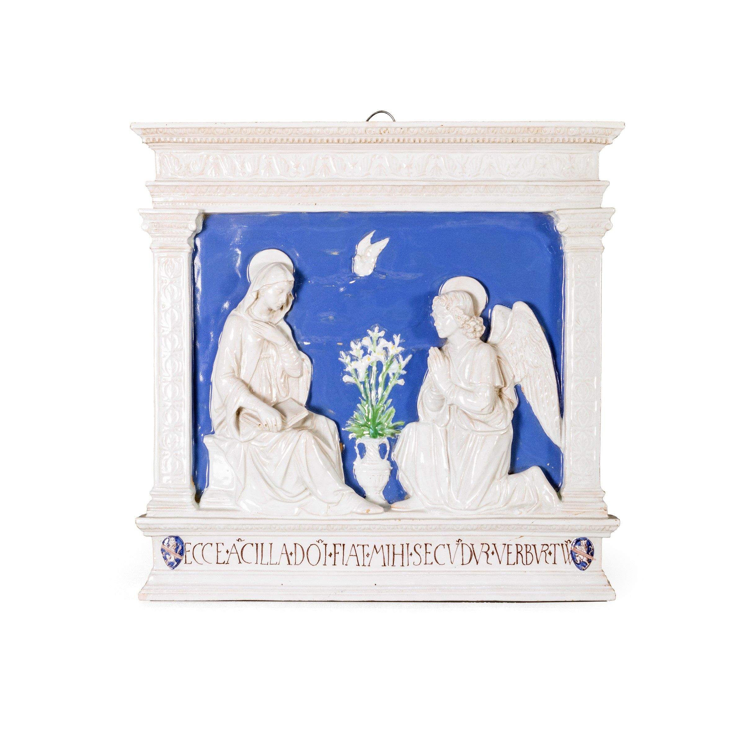 Firenze, XIX-XX Sec. placca in terracotta invetriata raffigurante l'Annunciazione, copia da Andrea della Robbia, restauri