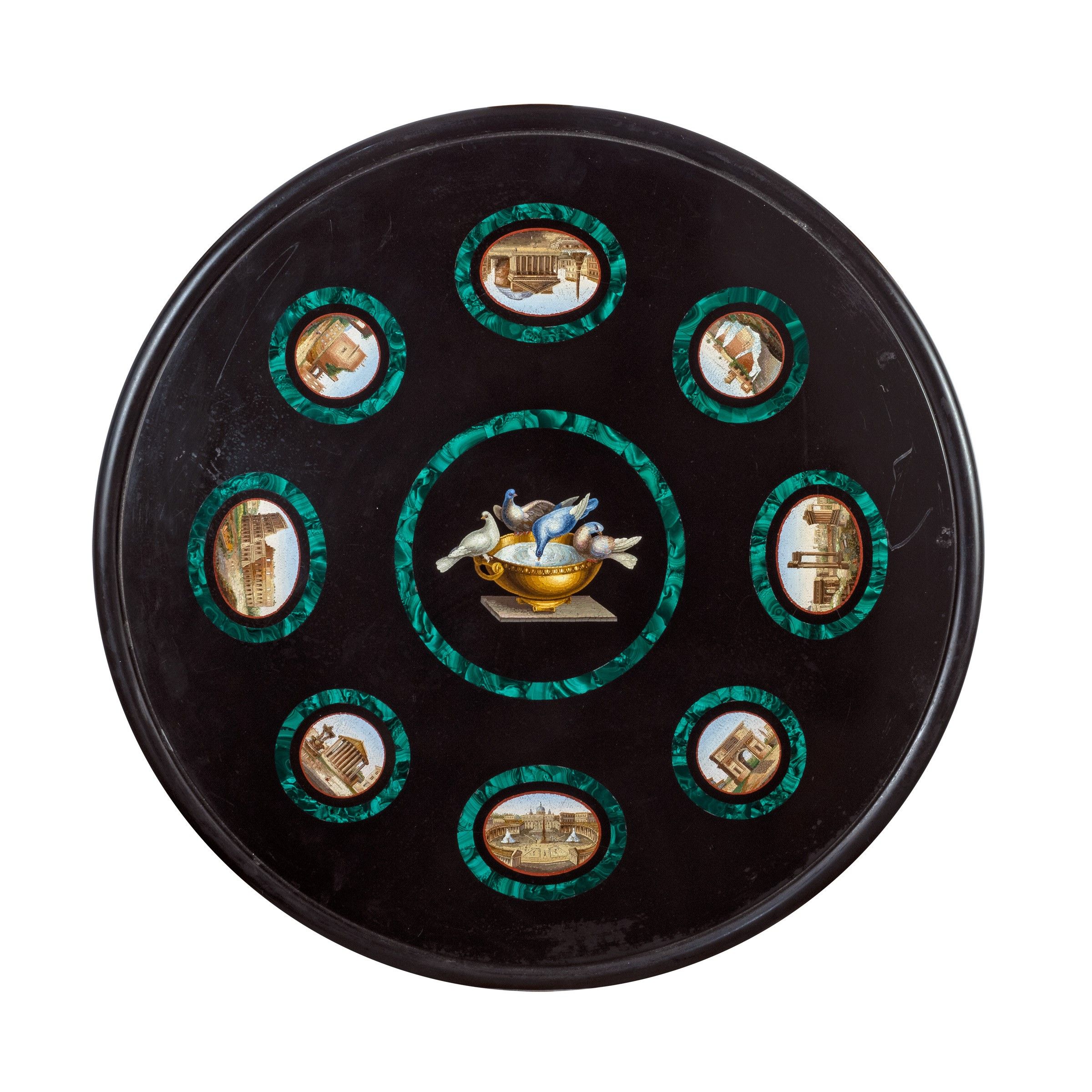 Roma, XIX Sec. di forma circolare raffigurante il Colosseo, Piazza San Pietro, i Fori Imperiali, l'Arco di Traiano, il Pantheon, la Fontana dei Tritoni ed il Tempio di Ercole Vincitore, Mausoleo di Cecilia Metella, Le Cascate di Tivoli ed al centro le Colombe di Plinio, entro riserve in malachite