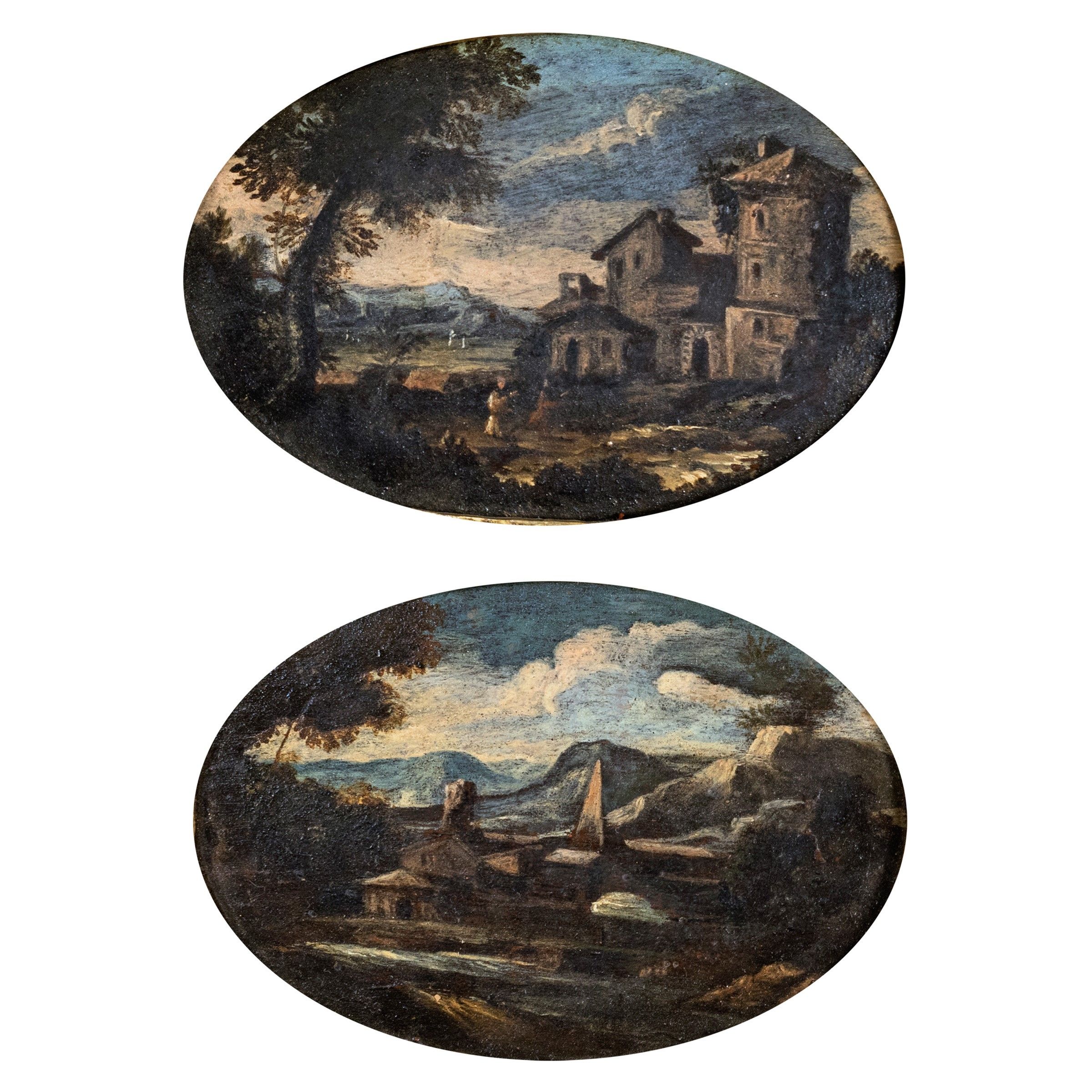 XVIII Sec. Campagna romana con casolari, coppia di oli su tavola, entro cornici