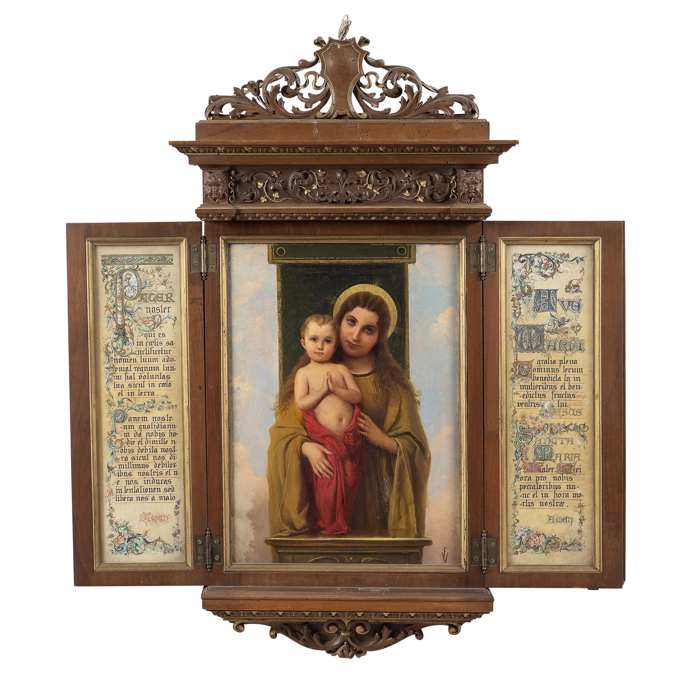 XIX-XX Sec. Madonna con Bambino, trittico olio su tavola, siglato FV in basso a destra, ai lati pergamene con il Padre Nostro e l'Ave Maria