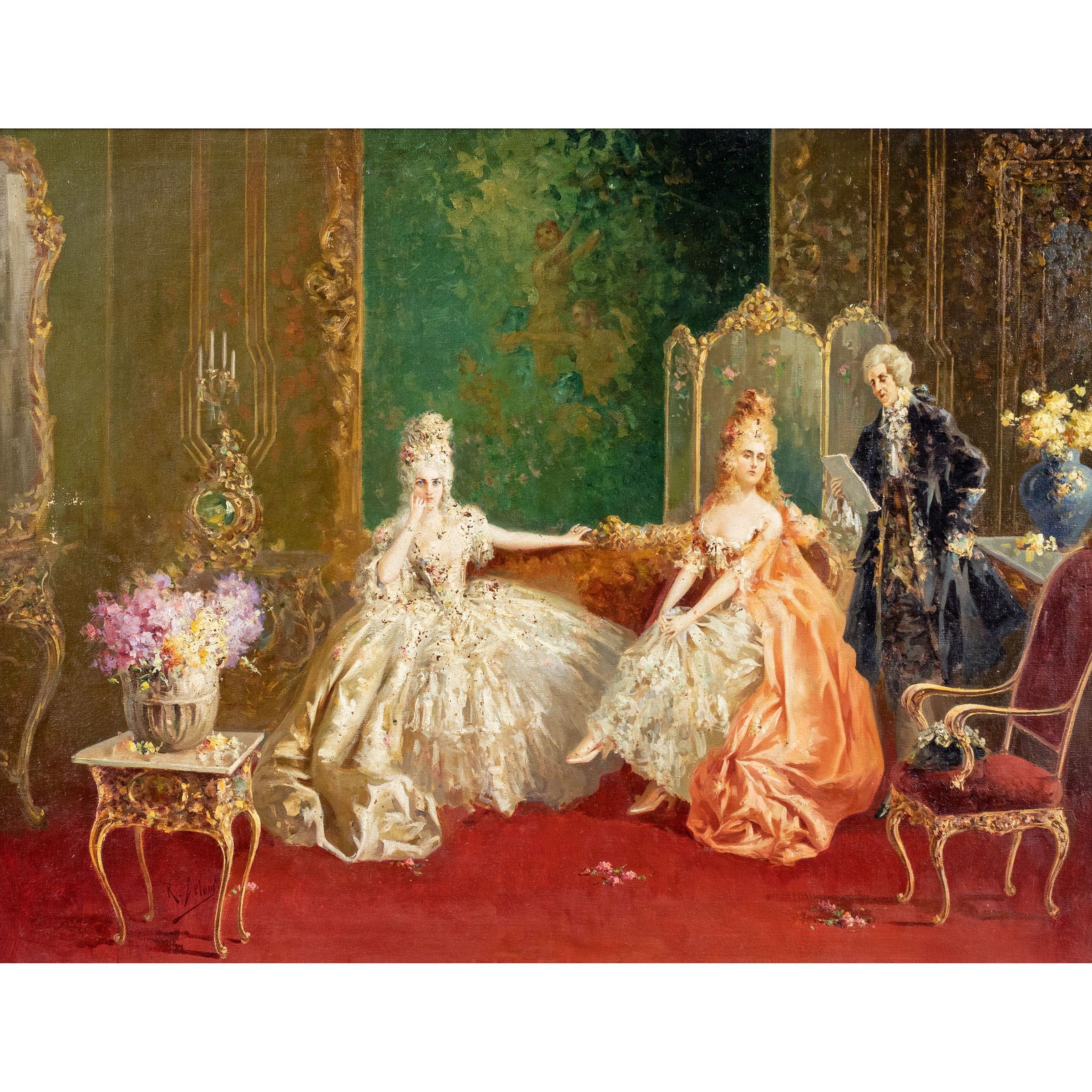Italia XIX - XX Sec. Scena d'interno con figure, olio su tela, firmato in basso a sinistra, entro cornice