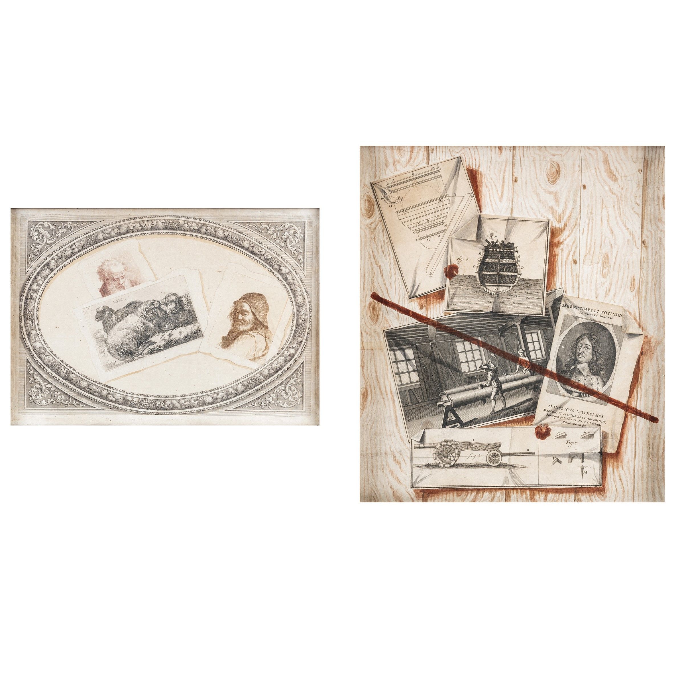 XVIII Sec. Trompe l’oeil, due stampe acquerellate su carta, entro cornici