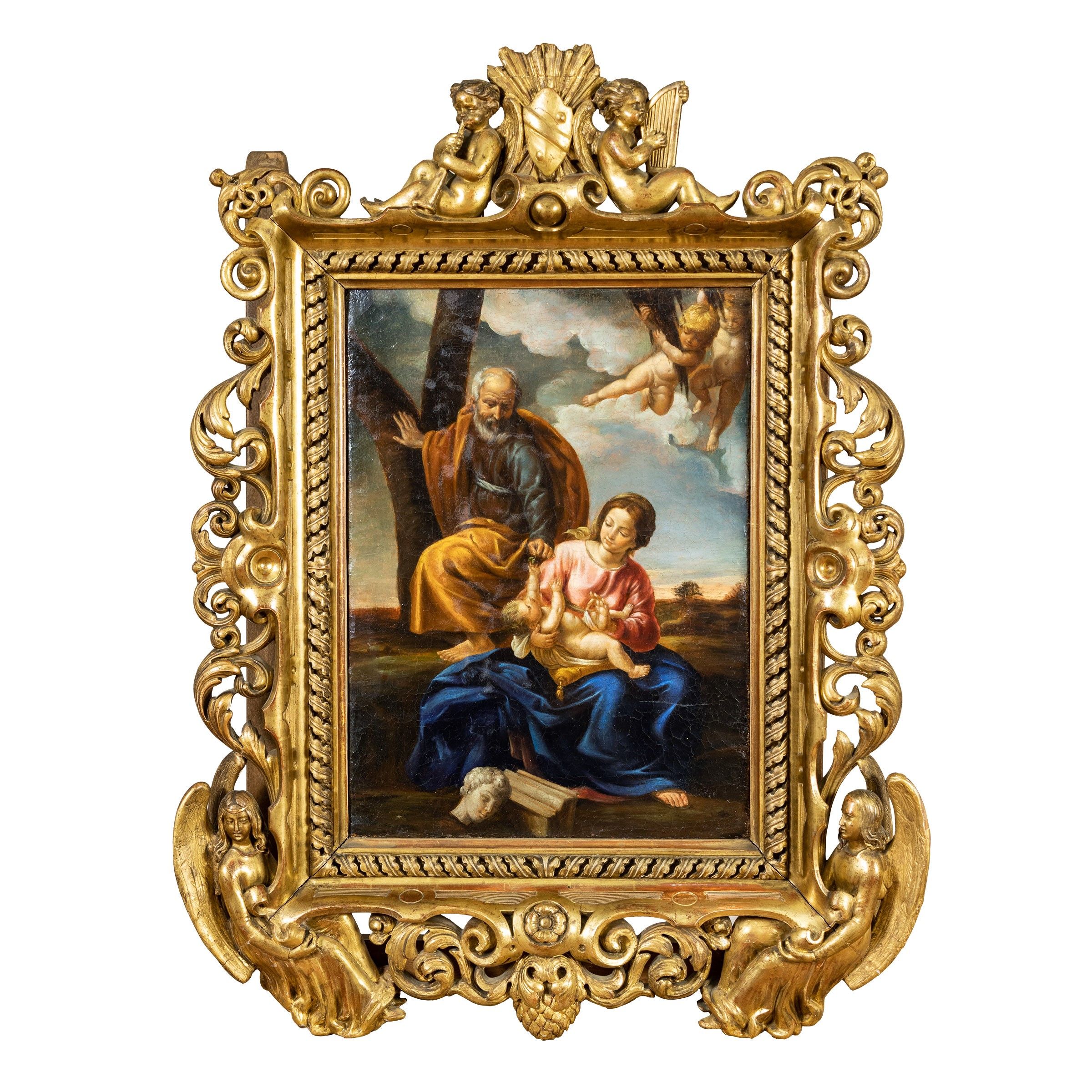 XIX Sec. Riposo durante la fuga in Egitto, olio su tela, entro cornice in legno dorato scolpito ed intagliato