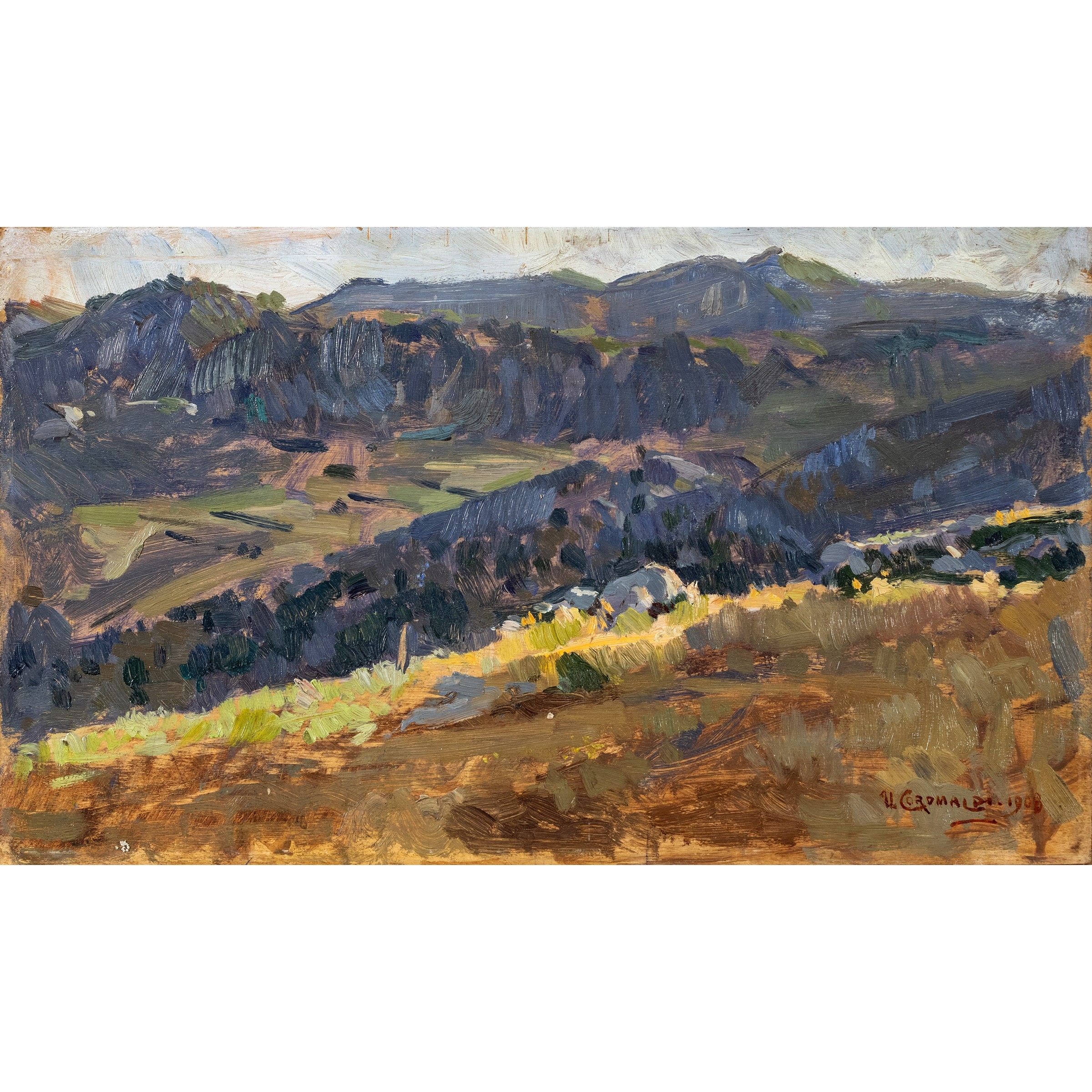 Roma 1870 - 1948 Paesaggio, 1908, olio su tavola, firmato e datato in basso a destra, entro cornice