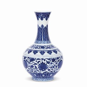VASO, CINA, DINASTIA MING, SEC.XVII in porcellana bianco e blu a forma di zucca con collo lungo a forma Gu raffigurante [..]