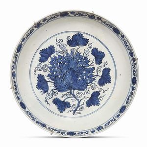PIATTO, CINA, DINASTIA MING, SEC.XVI-XVII in porcellana bianco e blu decorato con rami di vite e grappoli d'uva. [..]