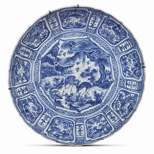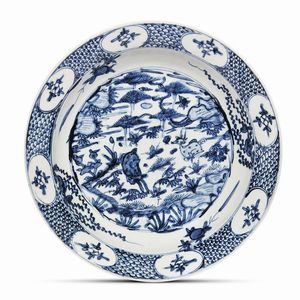 PIATTO, CINA, DINASTIA QING, SEC.XVII in porcellana bianco e blu con decoro con cervi e piante entro le riserve. [..]