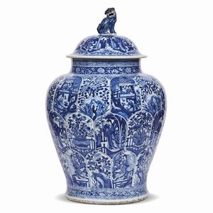 VASO CON COPERCHIO, CINA, DINASTIA QING, SEC.XVIII in porcellana bianco blu a forma Jiangjunping decorato con [..]