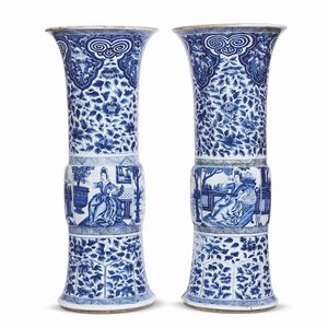 COPPIA VASI, CINA, DINASTIA QING, SEC.XVIII in porcellana bianco e blu a forma di Gu, dipinto con nobildonne. [..]