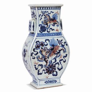 VASO, CINA, DINASTIA QING, SEC.XIX-XX in porcellana bianco blu e rosso sotto smalto a forma di Hu squadrato, decorato [..]