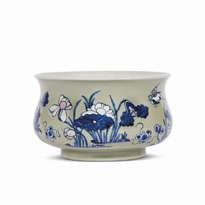 GRANDE CIOTOLA, CINA, DINASTIA QING, SEC.XVIII in porcellana celadon bianco e blu, raffigurante fiori di loto [..]