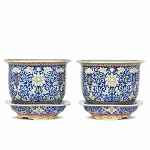 COPPIA DI GIARDINIERE, CINA, PERIODO DELLA REPUBBLICA (1912-1949) base in porcellana blu e decorazioni sovrastanti [..]