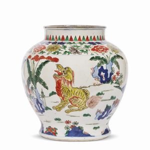 VASO, CINA, DINASTIA QING, SEC.XVII in porcellana bianco blu Wucai a forma di orcio, raffigurante quattro Qilin [..]