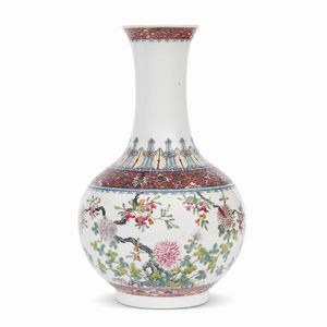 VASO, CINA, DINASTIA QING, SEC.XVIII in porcellana policroma Famiglia Rosa a forma Jiangjunping decorato con fiori [..]