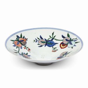 CIOTOLA, CINA, DINASTIA QING, SEC.XVIII in porcellana bianco blu Wucai a forma di conica decorato con frutti [..]