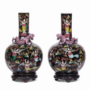 COPPIA DI VASI, CINA, DINASTIA QING, SEC.XX a forma Tianqiuping in porcellana smalto nero con mostri marrini海妖 [..]